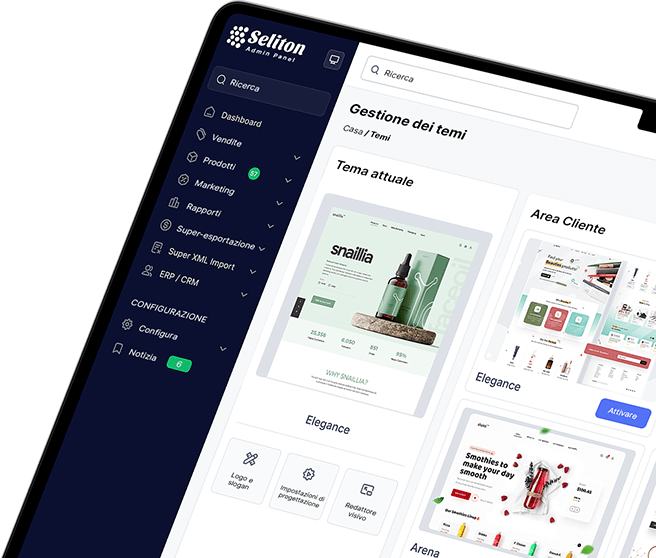 La piattaforma SELITON è adatta per piccole, medie e grandi imprese. Grazie alla sua unica scalabilità e stabilità, il negozio online Seliton funziona perfettamente per ogni modello di business e industria. Qualunque cosa tu venda, con Seliton è facile crescere.